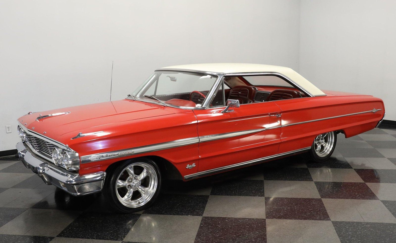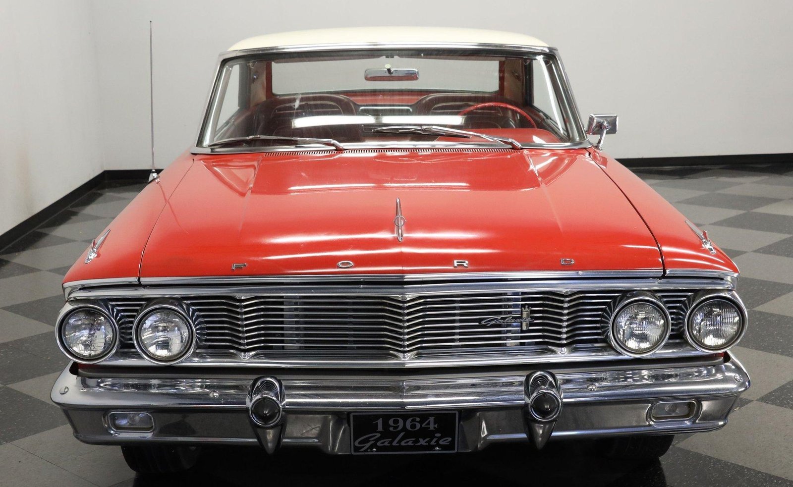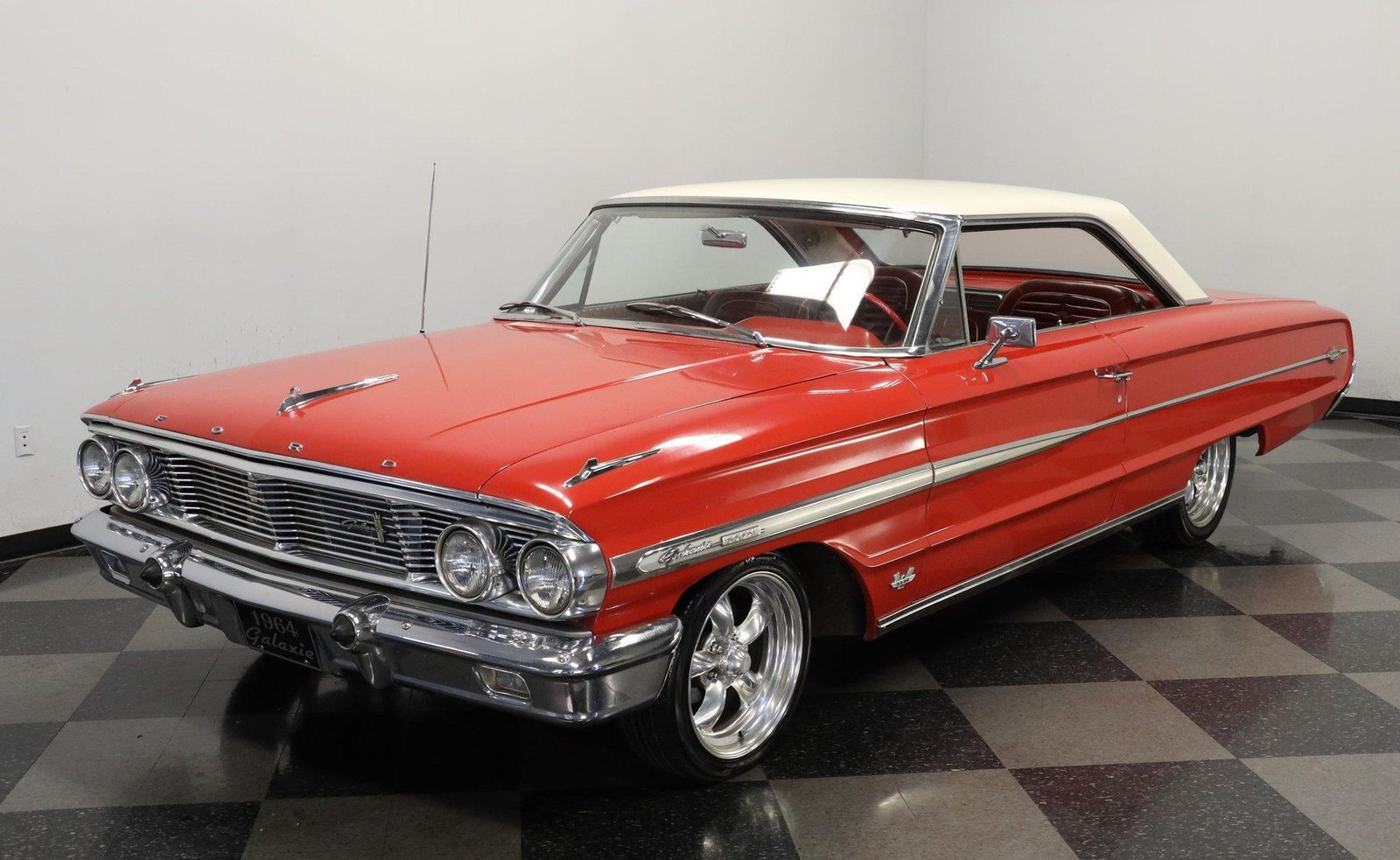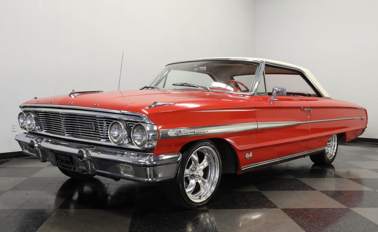 A stunning 1964 Ford Galaxie 500XL Coupe finished in Rangoon Red with a contrasting Wimbledon White top — an original X-code car upgraded with a smooth 390 V8, C6 automatic, and elegant factory-correct styling.