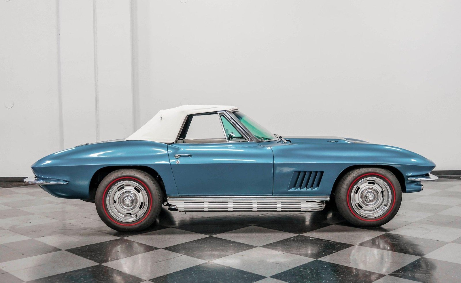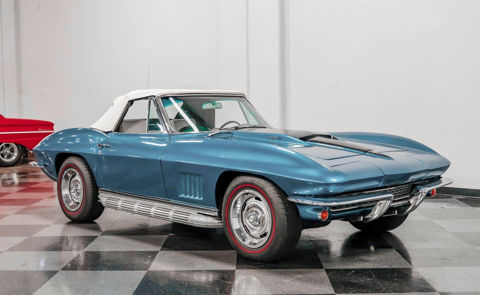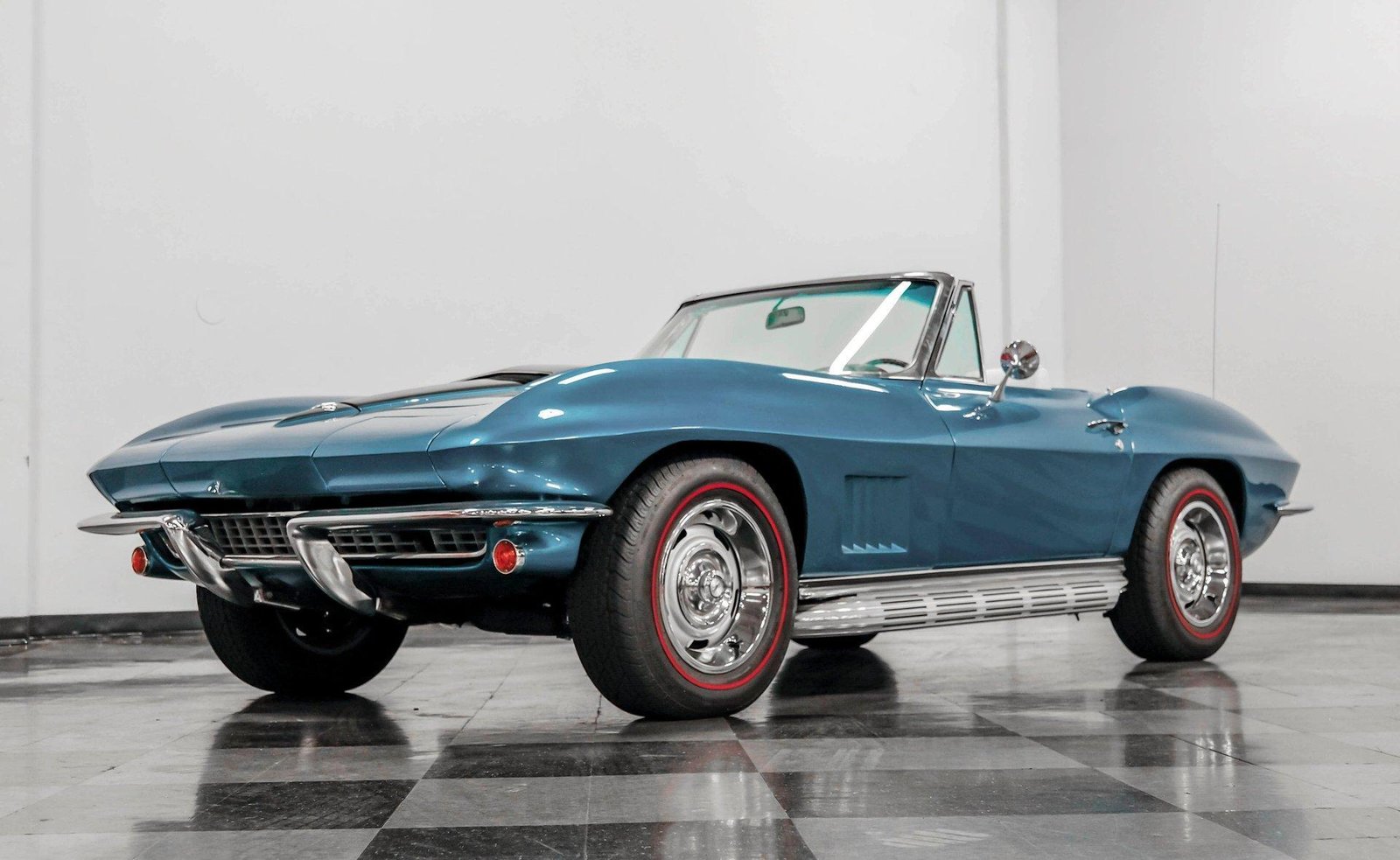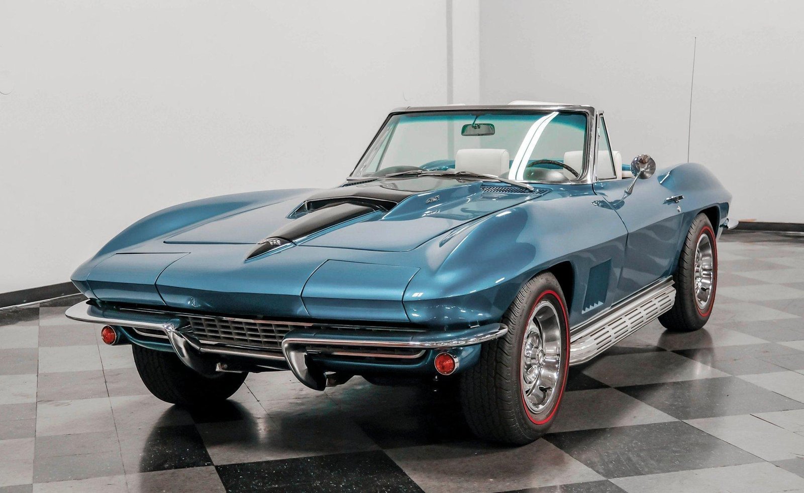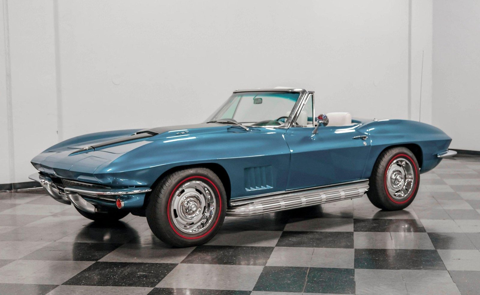 A beautifully presented 1967 Chevrolet Corvette 454 Convertible, finished in Marina Blue with a black stinger hood and white soft top — combining big-block muscle, four-speed control, and true C2 roadster appeal.