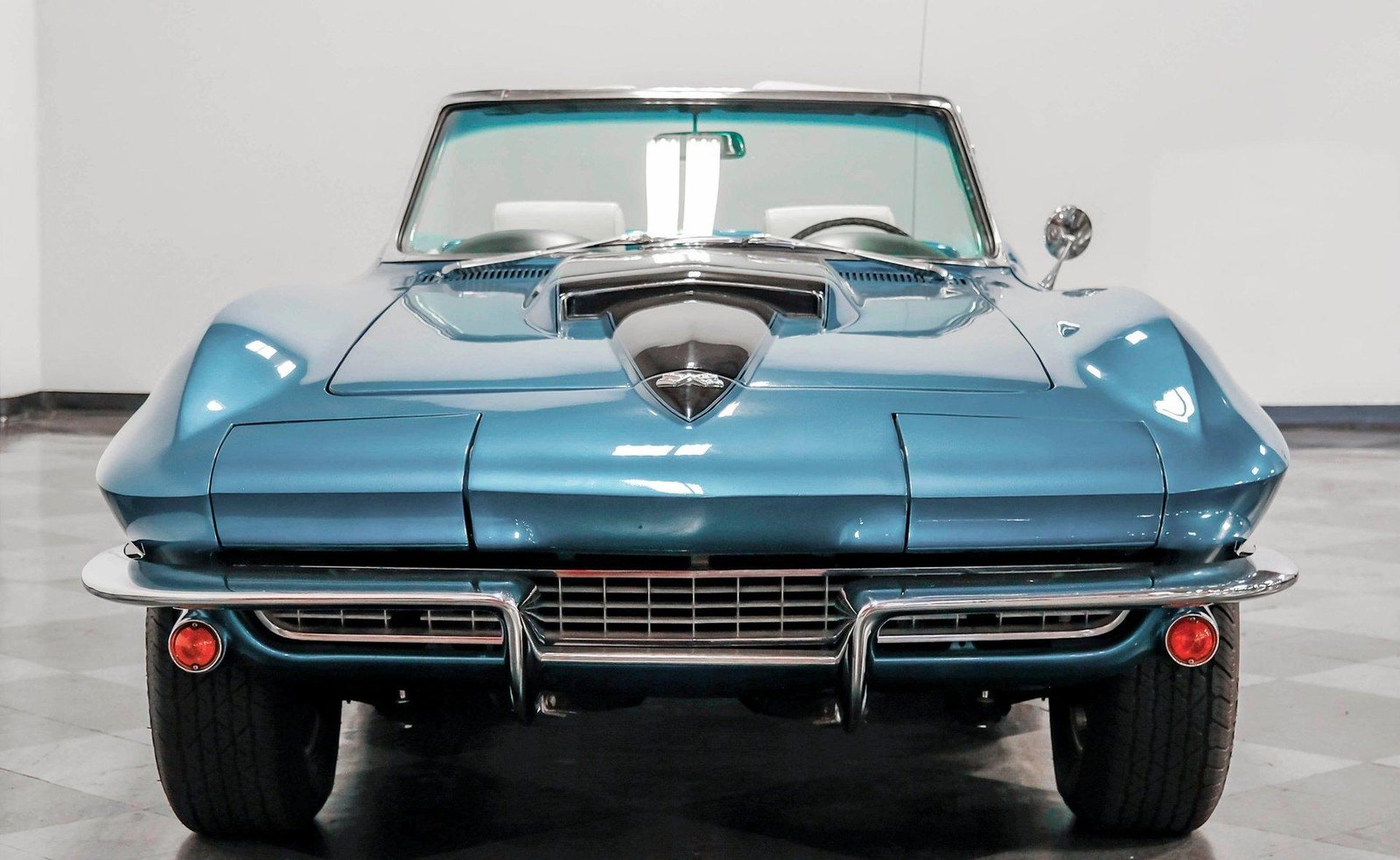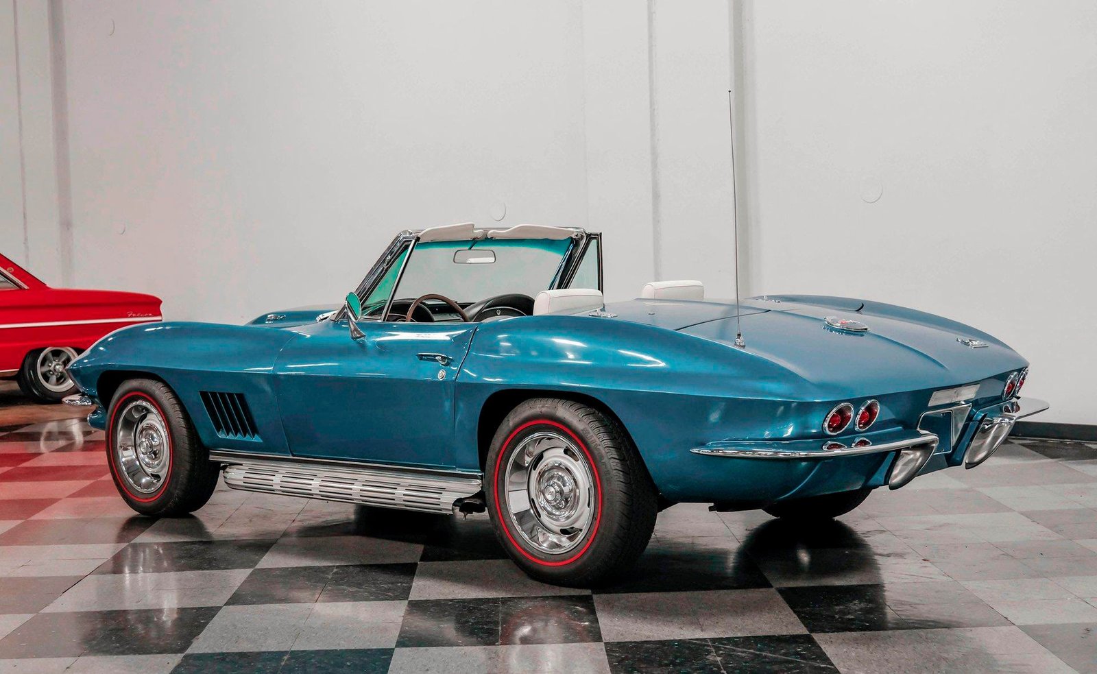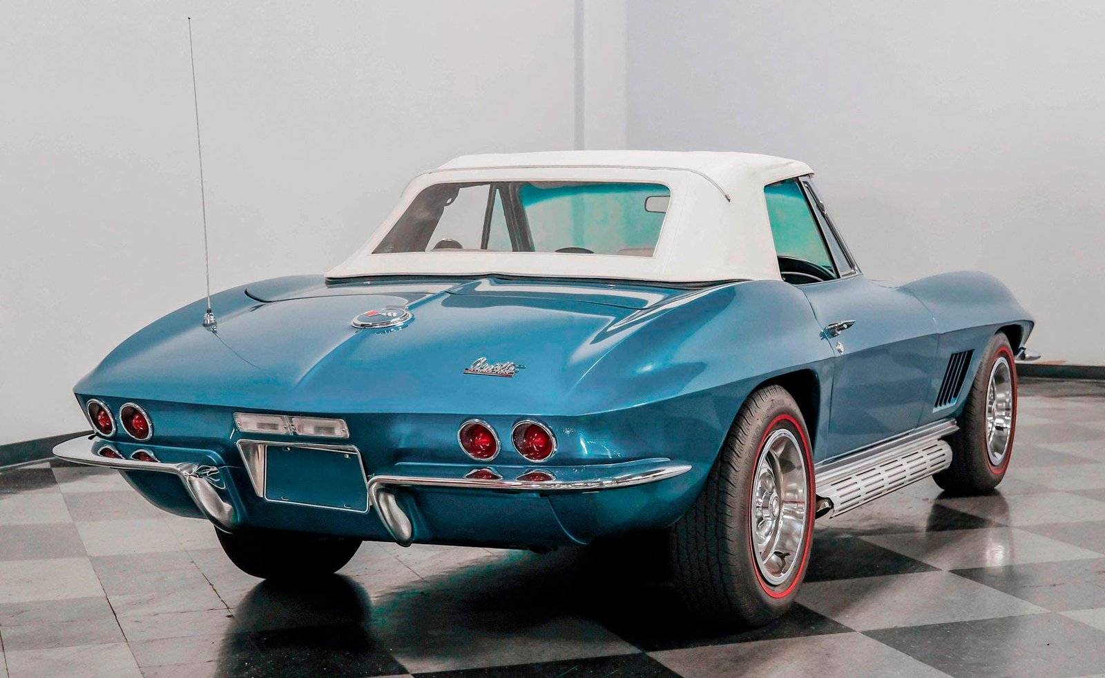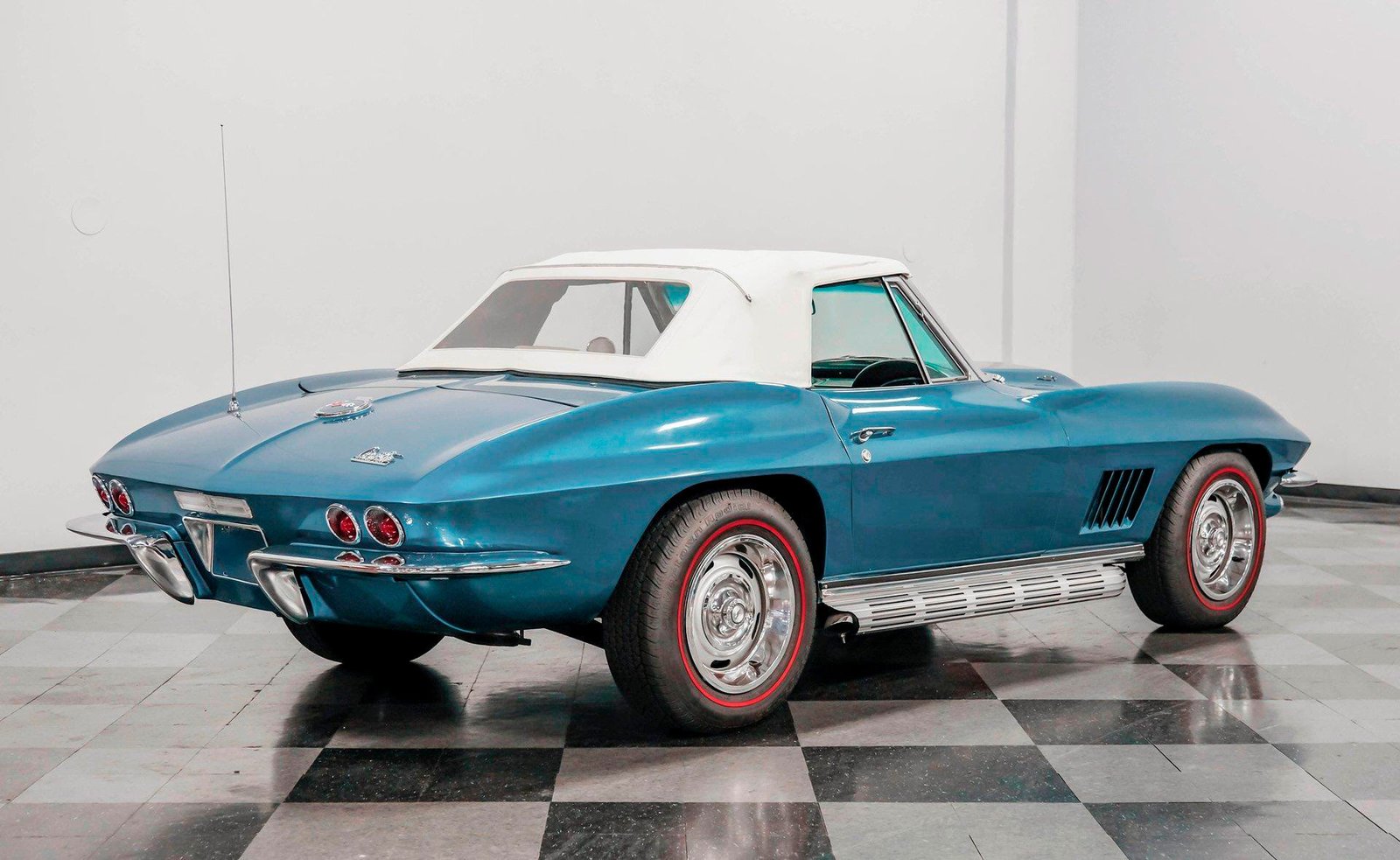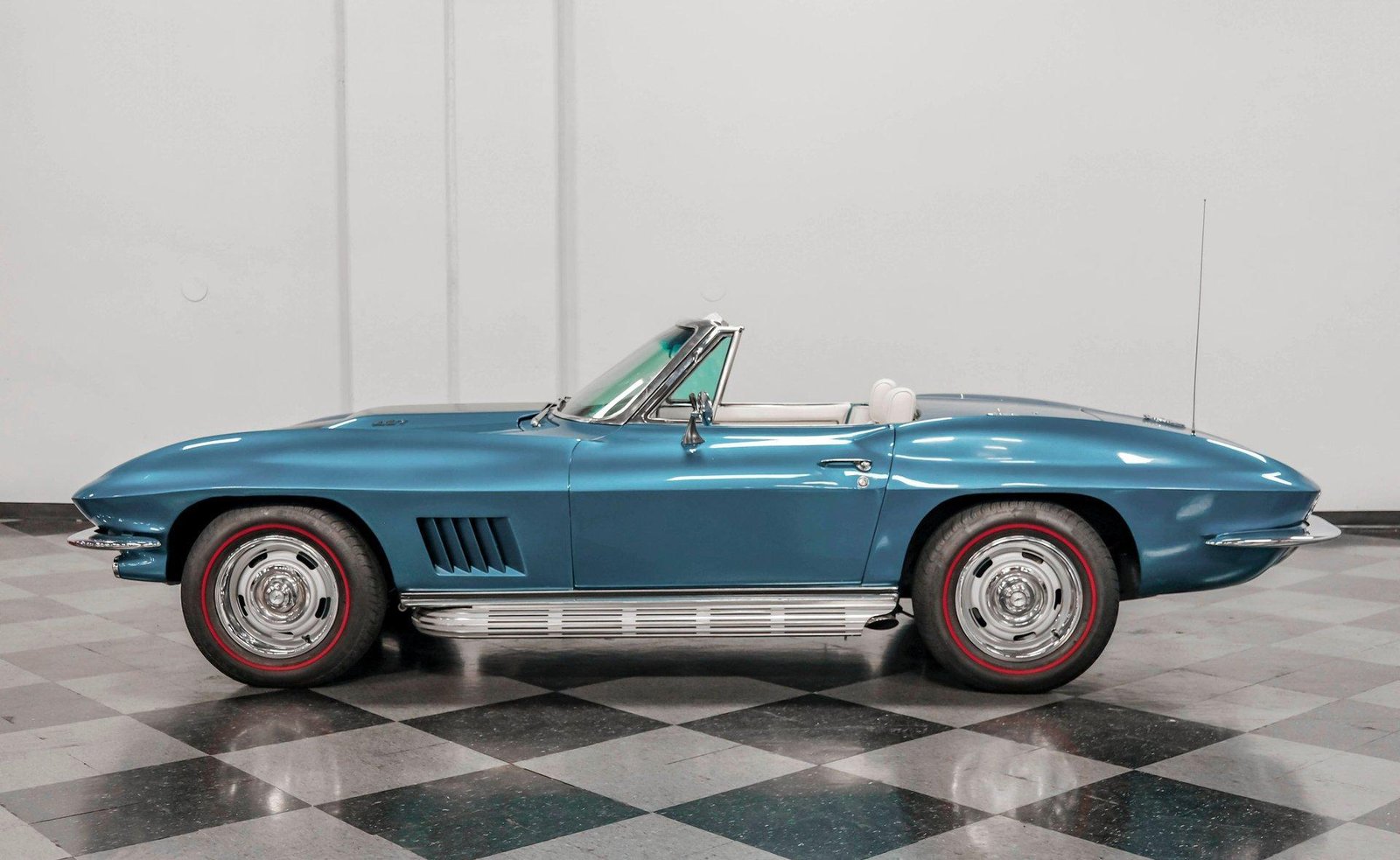 A beautifully presented 1967 Chevrolet Corvette 454 Convertible, finished in Marina Blue with a black stinger hood and white soft top — combining big-block muscle, four-speed control, and true C2 roadster appeal.