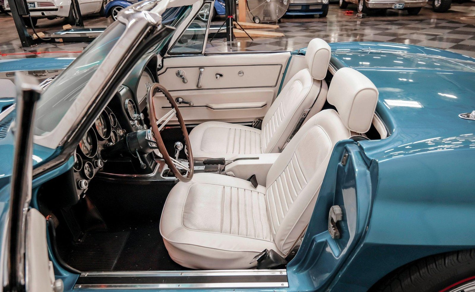 Interior: White vinyl bucket seats with rare headrests, teakwood steering wheel, center console with manual shifter, Delco AM/FM radio, working clock, and factory seatbelts in a clean period-correct cabin.