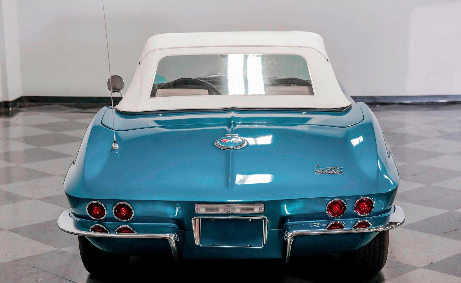 Exterior: Marina Blue exterior with black stinger hood, white convertible top, 15″ Rally wheels with beauty rings and caps, and 215/70R15 BFG Redline tires completing the classic performance look.