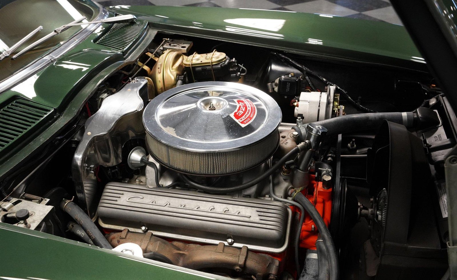 Exterior: Goodwood Green paint, stinger hood, Rally wheels with redline radial tires, and chrome accents completing its classic small-block Corvette stance.