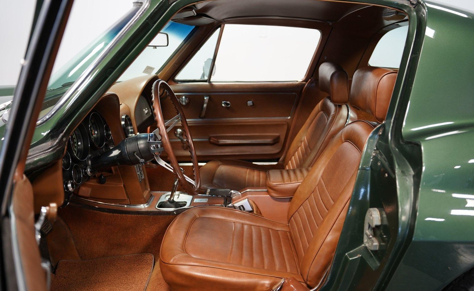 Interior: Saddle vinyl bucket seats with factory headrests, original-style gauges and trim, 4-speed floor shifter, and clean factory dash layout preserving the true 1967 Corvette atmosphere.