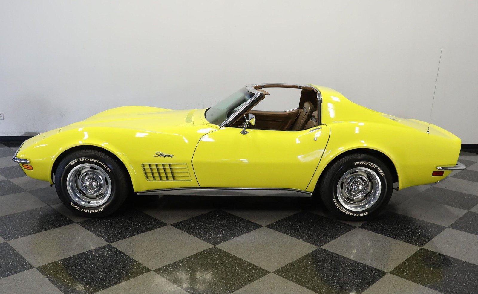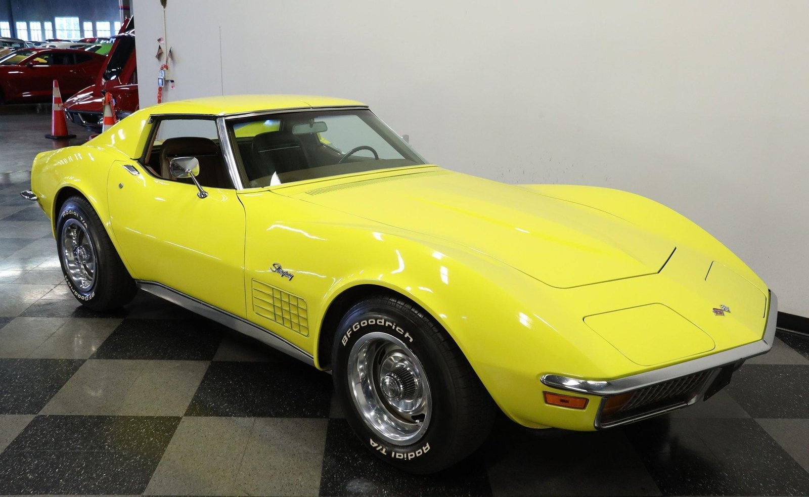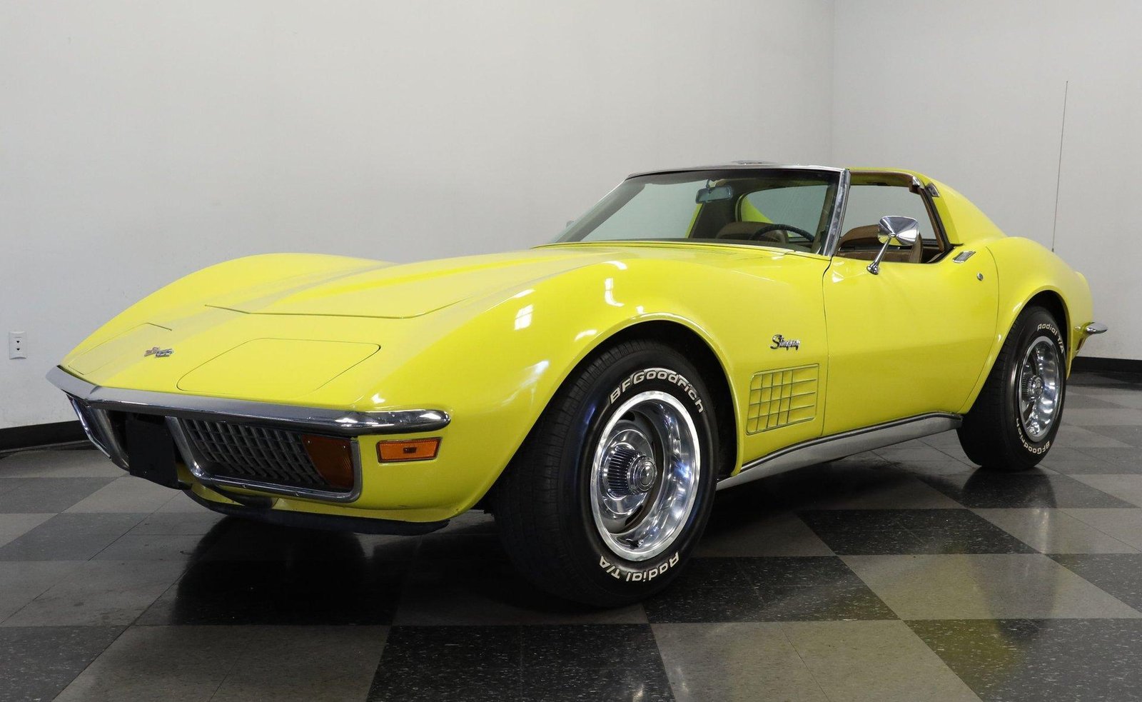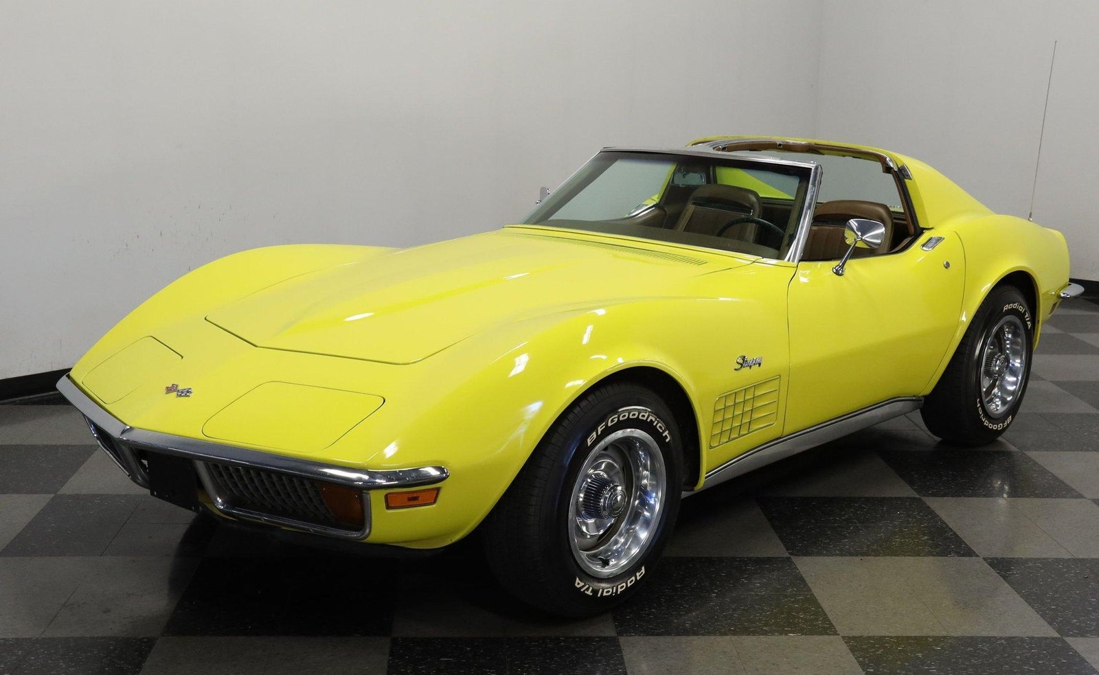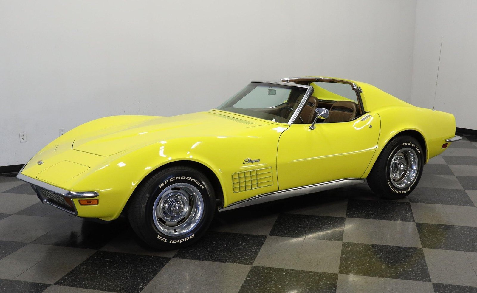 A low-mileage 1972 Chevrolet Corvette Coupe, finished in factory Sunflower Yellow with T-tops, chrome bumpers, and matching-numbers 350 V8 paired to a Muncie 4-speed manual — a true survivor in striking condition.
