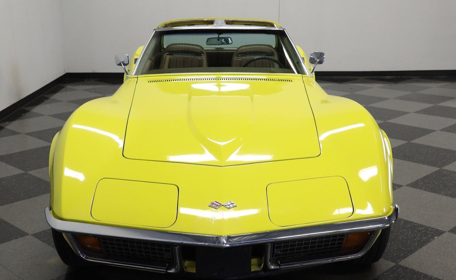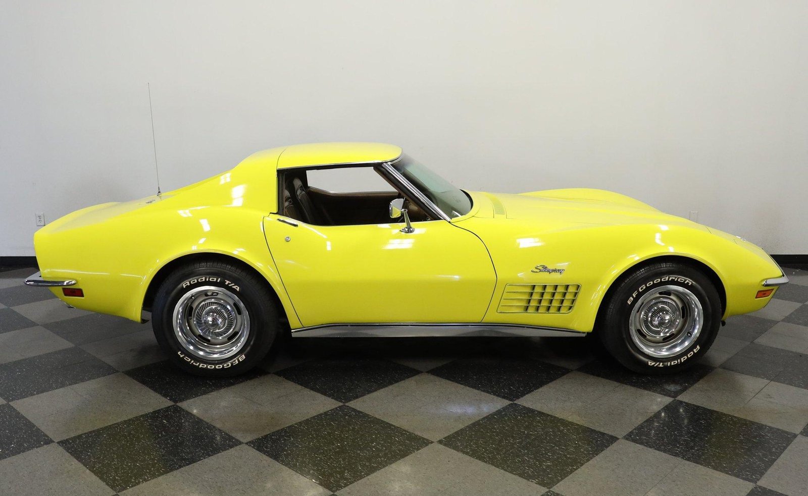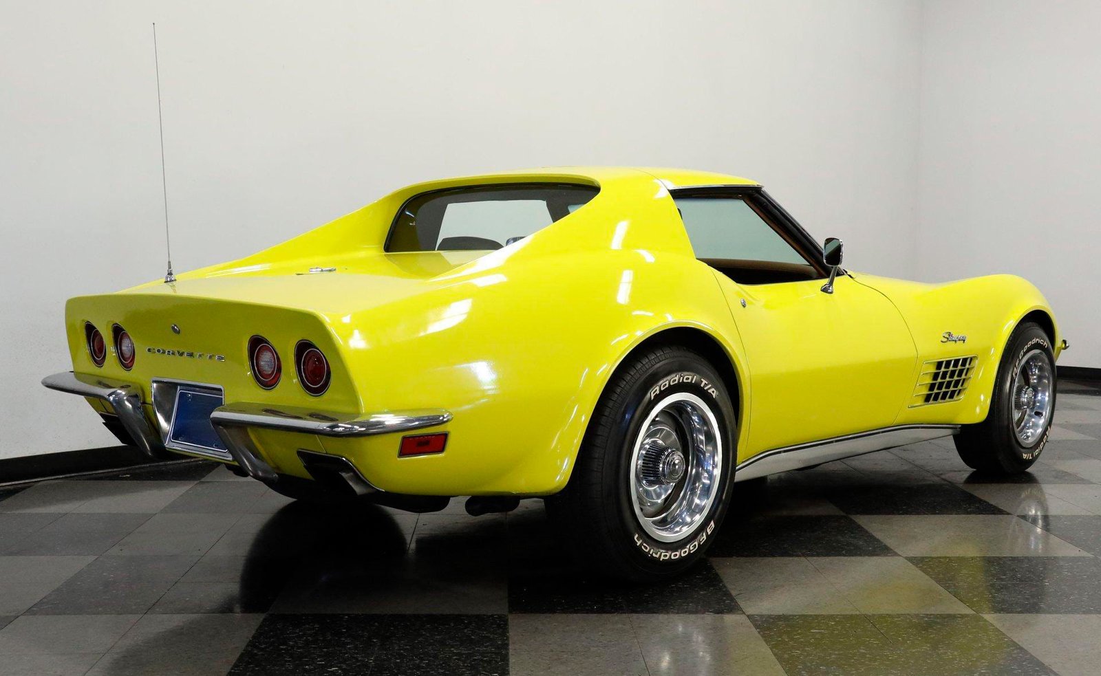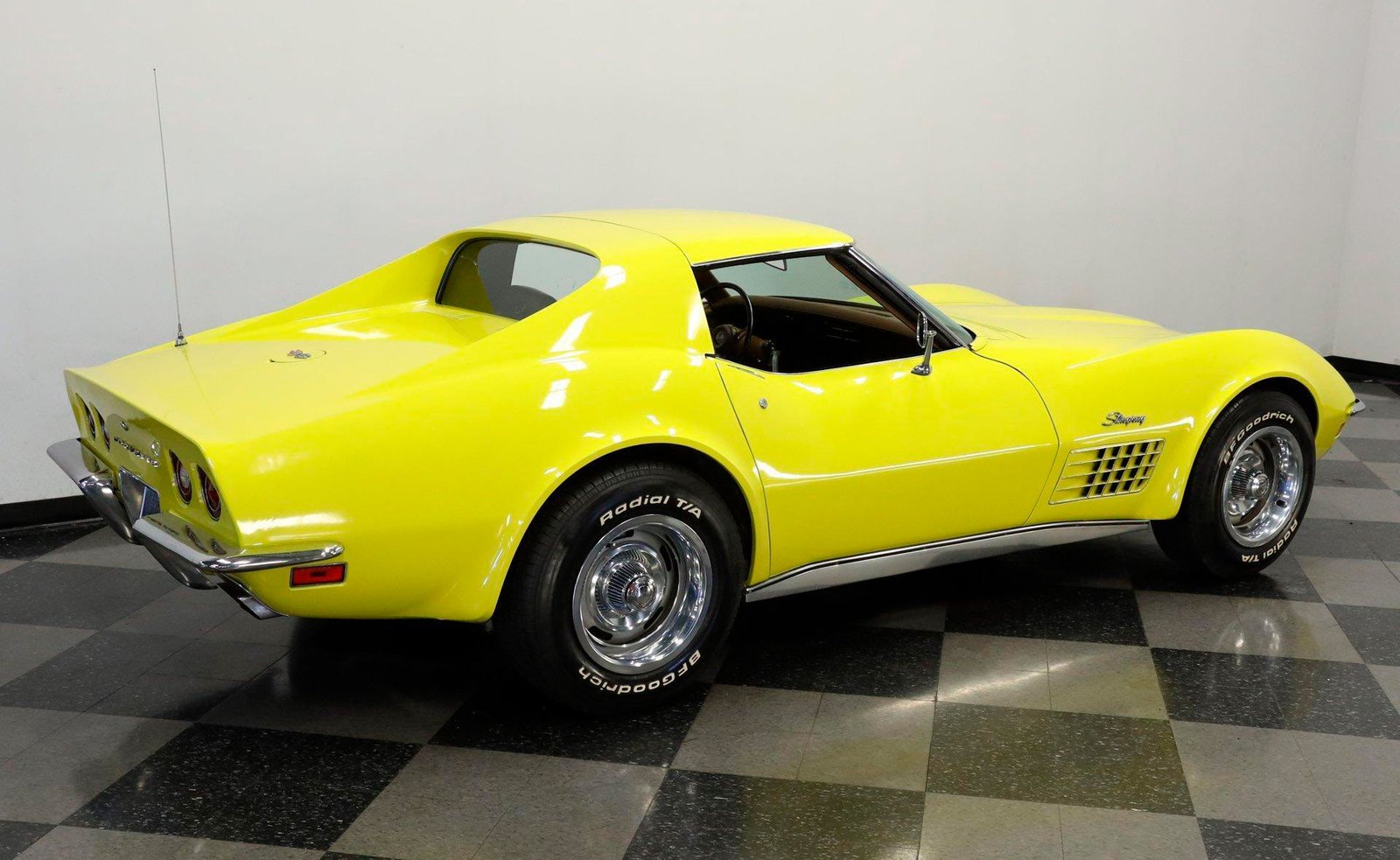 A low-mileage 1972 Chevrolet Corvette Coupe, finished in factory Sunflower Yellow with T-tops, chrome bumpers, and matching-numbers 350 V8 paired to a Muncie 4-speed manual — a true survivor in striking condition.